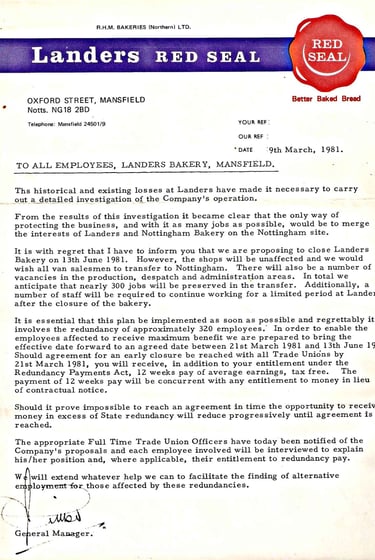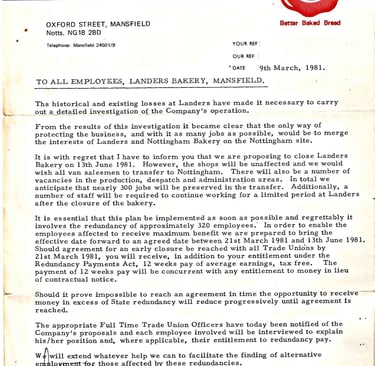 Reading through the pages of the Chad each week, I have been able to compile a list of some of the people who worked at Landers Bakery through the years: Pamela Baker; Doris Ball; Sam Ball (worked 18 years as an area supervisor), Arthur Barlow (delivery lad), Leslie Bedford (there for 18 years), Lilian Bown, Hilda Brownlow, Derek Buck (there for more than 24 years), Leslie Carter (Storeman until 1981), Alan Clark, Robert Clay (driver/salesman), Rhoda Cooke, Louis Crosby, George Davis (baker), Joseph Davis (25 years), Irene Devney (throughout the 1960s and 70s), Ronald Eveson (salesman from 1959 until 1981), William ‘Bill’ Fenwick, James Green, Alan Green (lorry driver), Albert Gunton (bakery operator or 20 years ret. 1964), Derek Halstead, (delivery driver), Elsie Hyatt, Winnie Jenks, Eric Latham, June McGarry, Iris Mitchell, Gerald Morgan, Thomas Noble, (baker for 30 years ret. 1981), Mary Nuttall (13 yrs), Phyllis Pincott (cleaner), Alan Poyser, Jeanette Shead, John Shuttleworth (1956 to 1977), Elsie Slater (cleaner, ret. 1971), Ronald Slater, John (Jack) Smith (23 yrs), Audrey Szczesny, Jesse Wallett (baker ret. 1969), Kenneth Ward (29 yrs), Audrey Wild (1965 to 1978), Jack Williams; Norah Wilson (office worker), Frank Wilson (sales supervisor for 26 years), Wilfred Winterton (ret. 1980), Margaret Wood and Hilda Wood worked there during the Second World War.