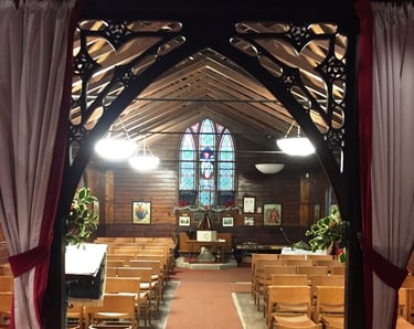 Below this, a view is taken from the screen looking towards the stained glass memorial window.