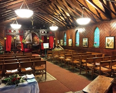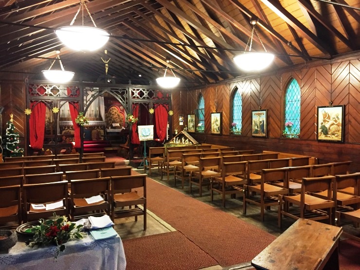The photo above shows the interior of the church. The walls are beautifully lined with wood and the screen is intricately carved. The lectern and altar rail supports are made of wrought iron.
