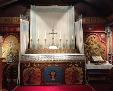 To the sides of the altar can be seen panels of hand-painted flowers. The arch decorated for a wedding (below).