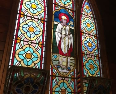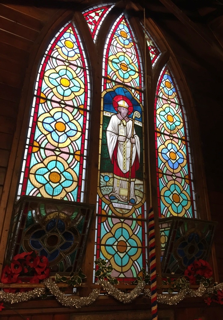 In the centre of the memorial stained glass window to Joseph and his wife Helen is a full length picture of St Chad.