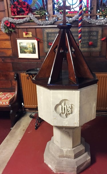 The octagonal font is made from stone and wood and stands on a plinth and is carved with the letters ‘ihs’.