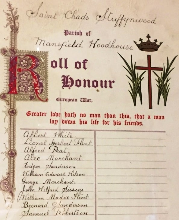 The roll of honour for the soldiers from the village who served their country and died in the First World War shows the names: Albert White, Lionel Herbert Flint, Alfred Peat, Alec Marchant, Edgar Sanderson, William Edward Wilson, George Marchant, John Wilfred Sissons, William Madox Flint, Bernard Sanderson and Samuel Robertson.