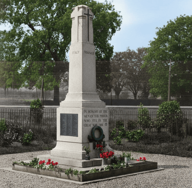 The Cornish granite memorial is 12½ feet high, weighs two tons and was cut by the Bromsgrove Guild Works. It features a square plinth of two steps, and carved on the four sides are the words France, Belgium, Gallipoli and Italy. On the side of the memorial facing the park entrance there is a bronze wreath and above a dedicatory inscription reads – ‘In honour of the men of this parish who fell in the Great War 1914-18’. Four bronze plaques are inscribed with the names of 226 local men who fought and died in the First World War. The total cost of the memorial was £529 and was paid for by voluntary public subscription.